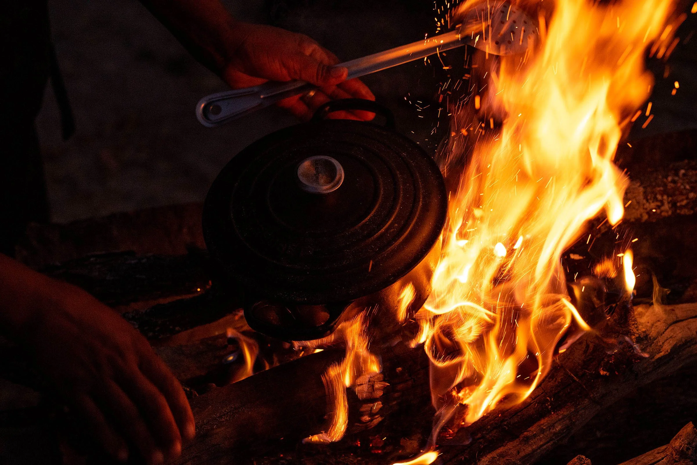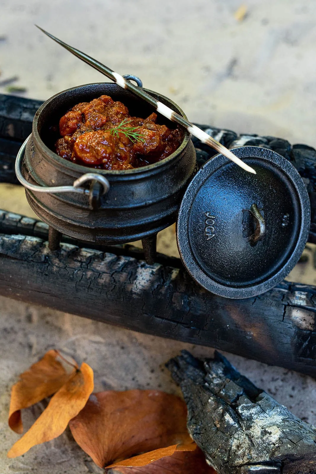 A small cast iron pot filled with beef stew on a campground fire pit, with a black lid beside it, set on a log surrounded by dry leaves.