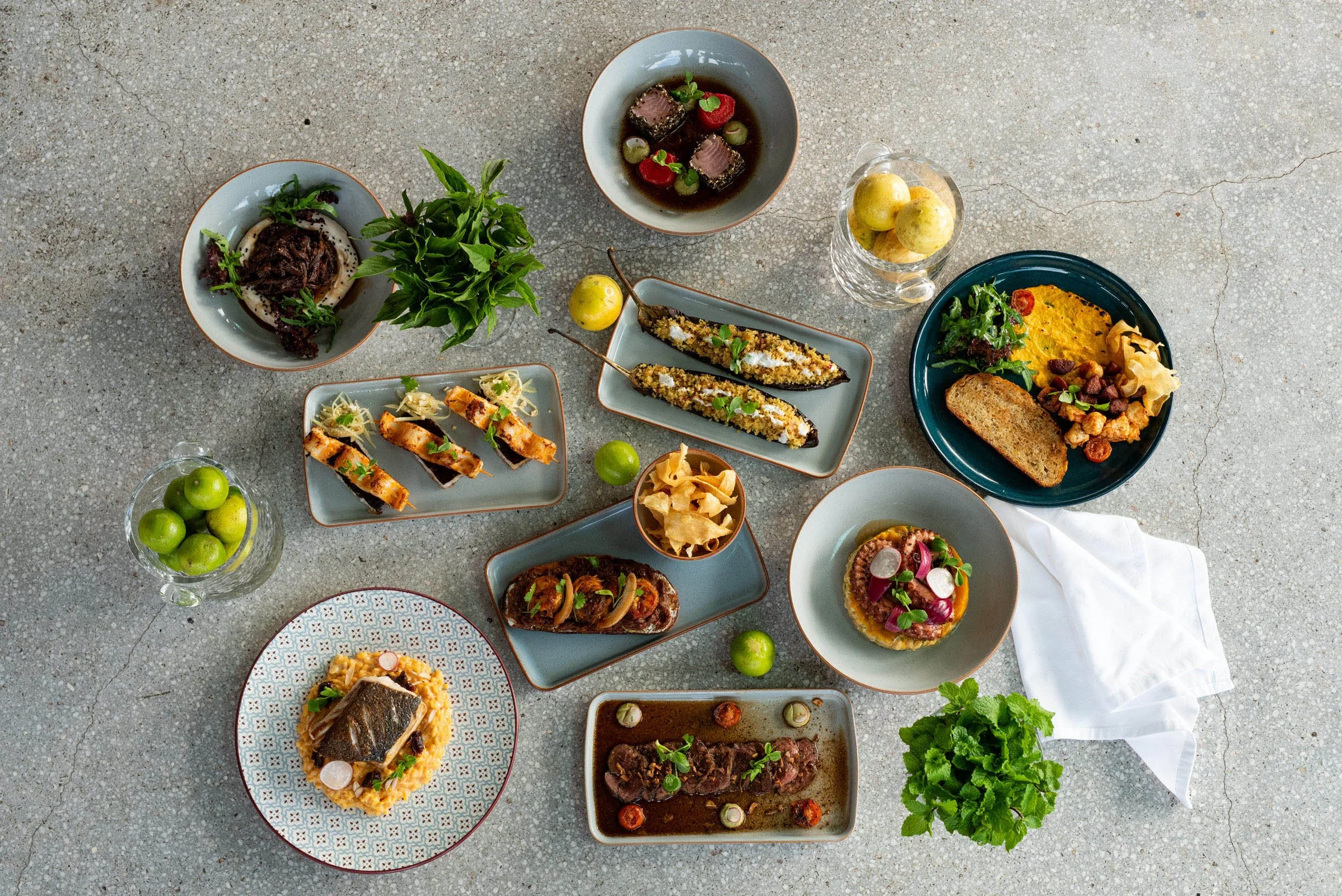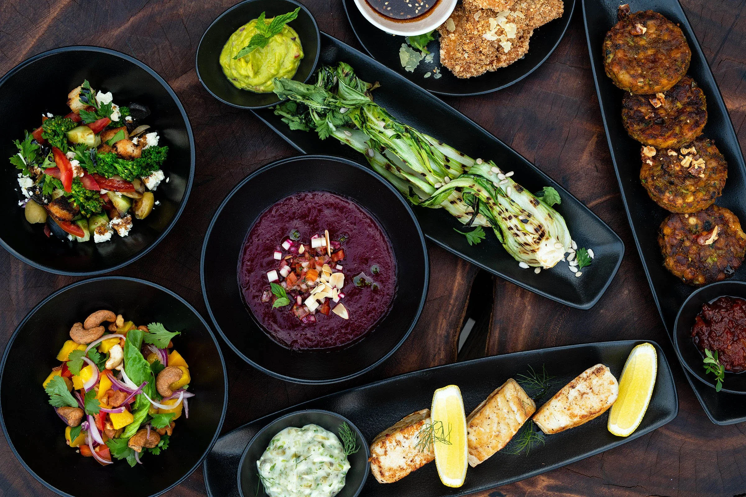 A variety of dishes including grilled vegetables, bread, small desserts, and salads on dishes, with glasses of green grapes and a potted herb, arranged on a textured gray surface.