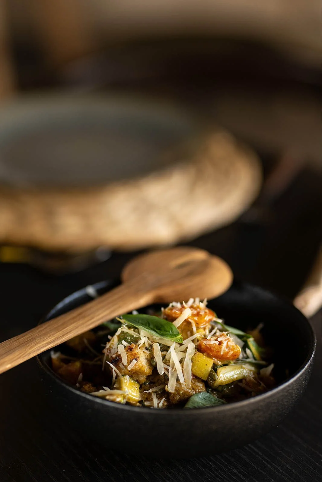 A black bowl of cooked vegetables topped with cheese, garnished with basil leaves, and a wooden spoon resting on the bowl, with a blurred background.