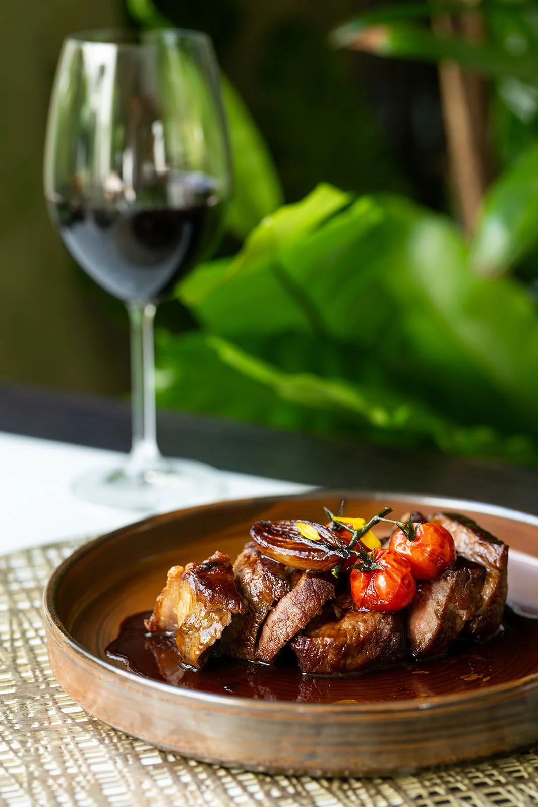 A glass of red wine and a plate with cooked steak, garnished with cherry tomatoes and grilled onions, on a wooden plate with a green leafy plant in the background.