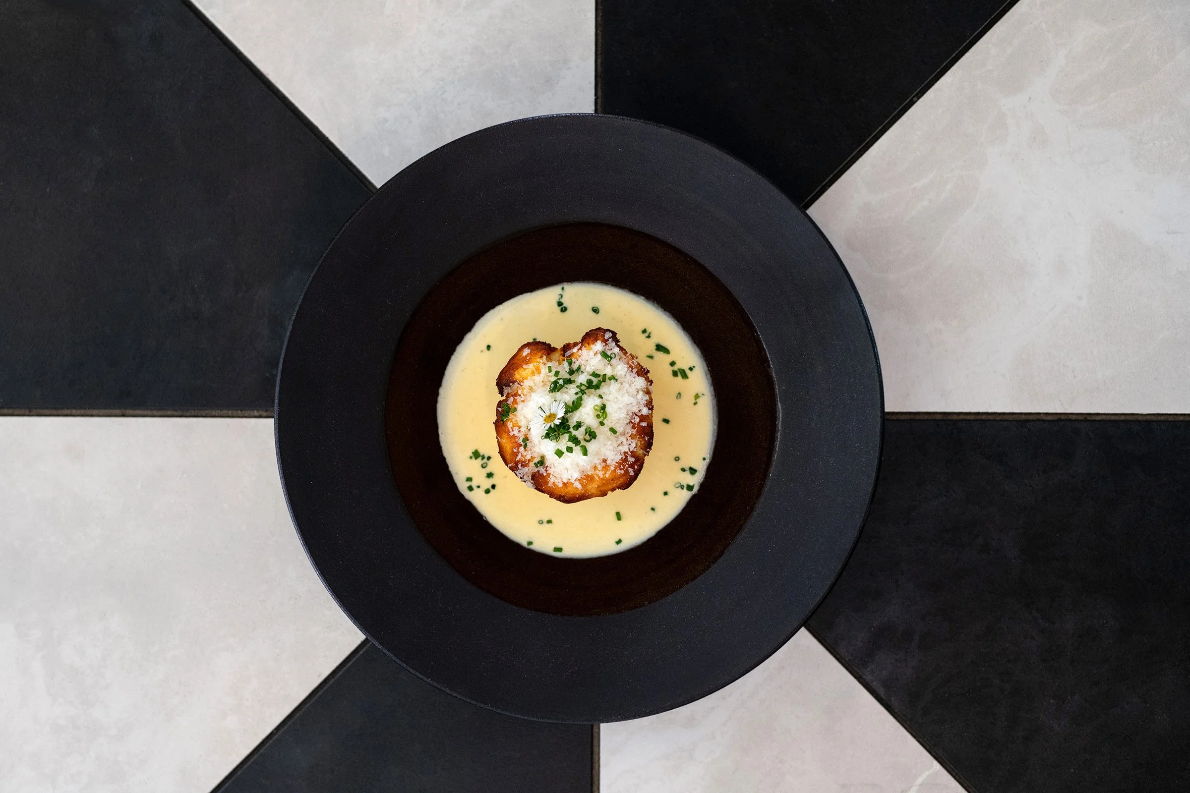 A black bowl containing a creamy soup with a breaded, fried item topped with grated cheese, chopped chives, and a small edible flower, on a black and white tiled surface.