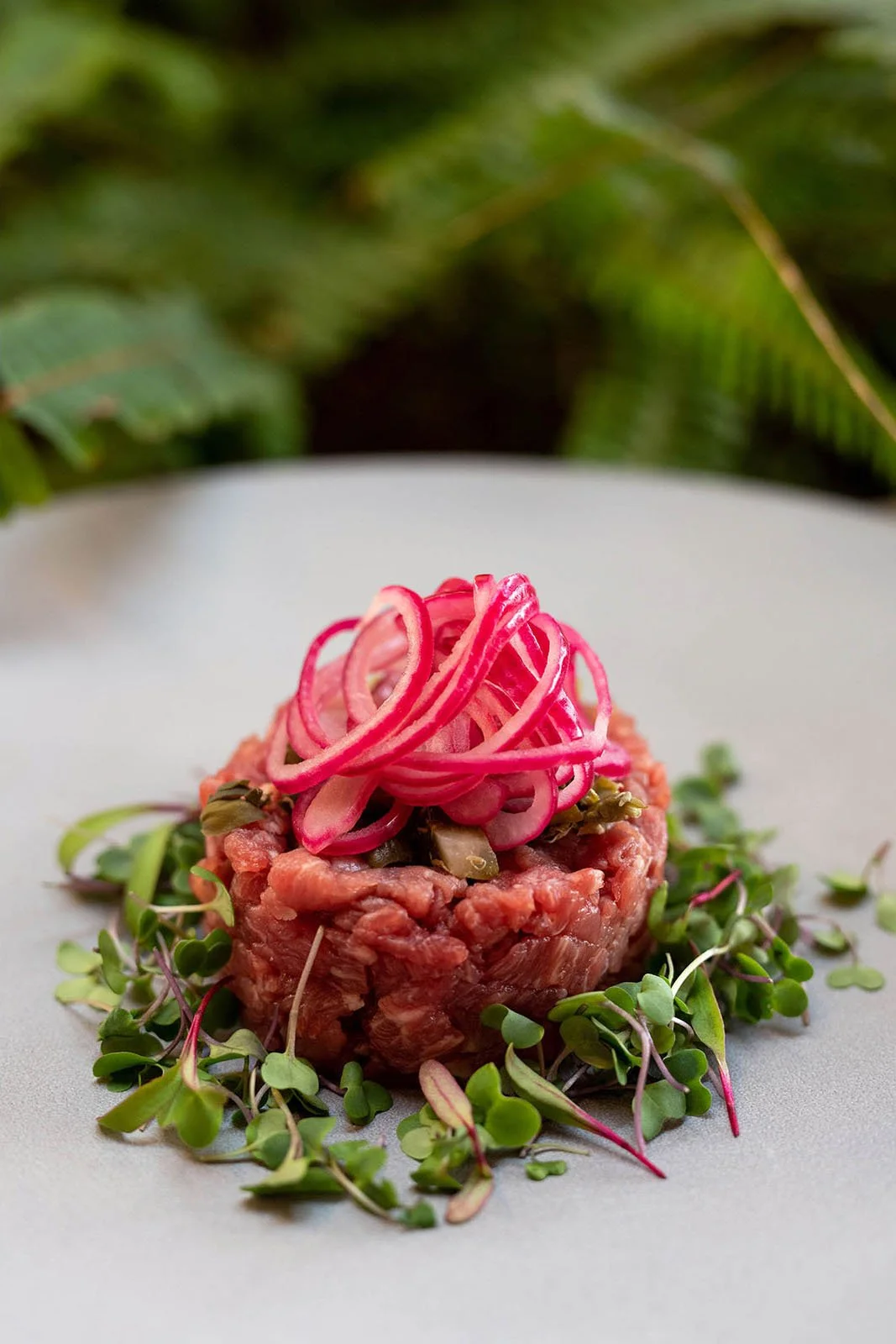Close-up of a steak tartare topped with pickled red onions and garnished with microgreens, on a light-colored plate. View fullsize