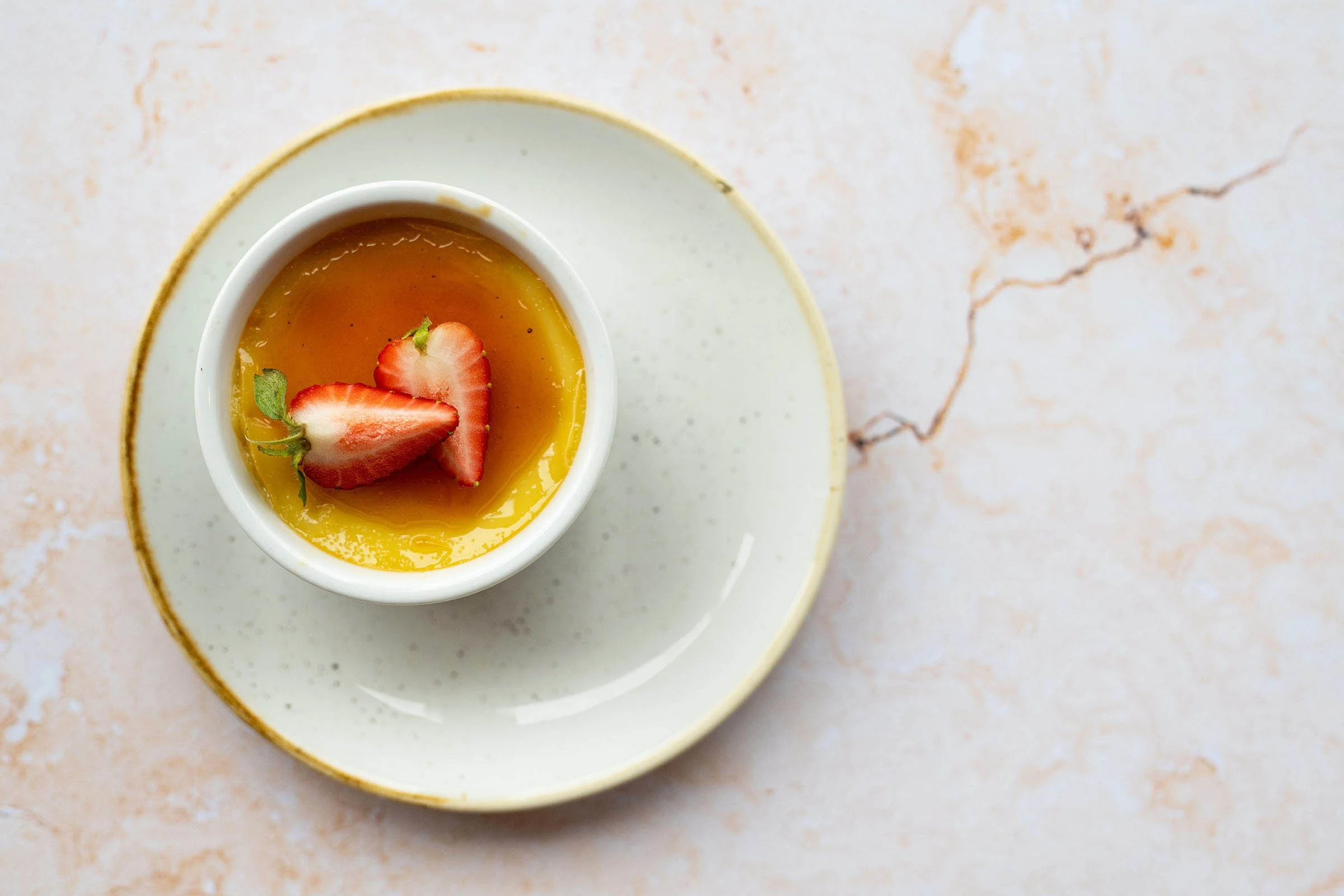 Cup of lemon curd topped with sliced strawberries on a white plate