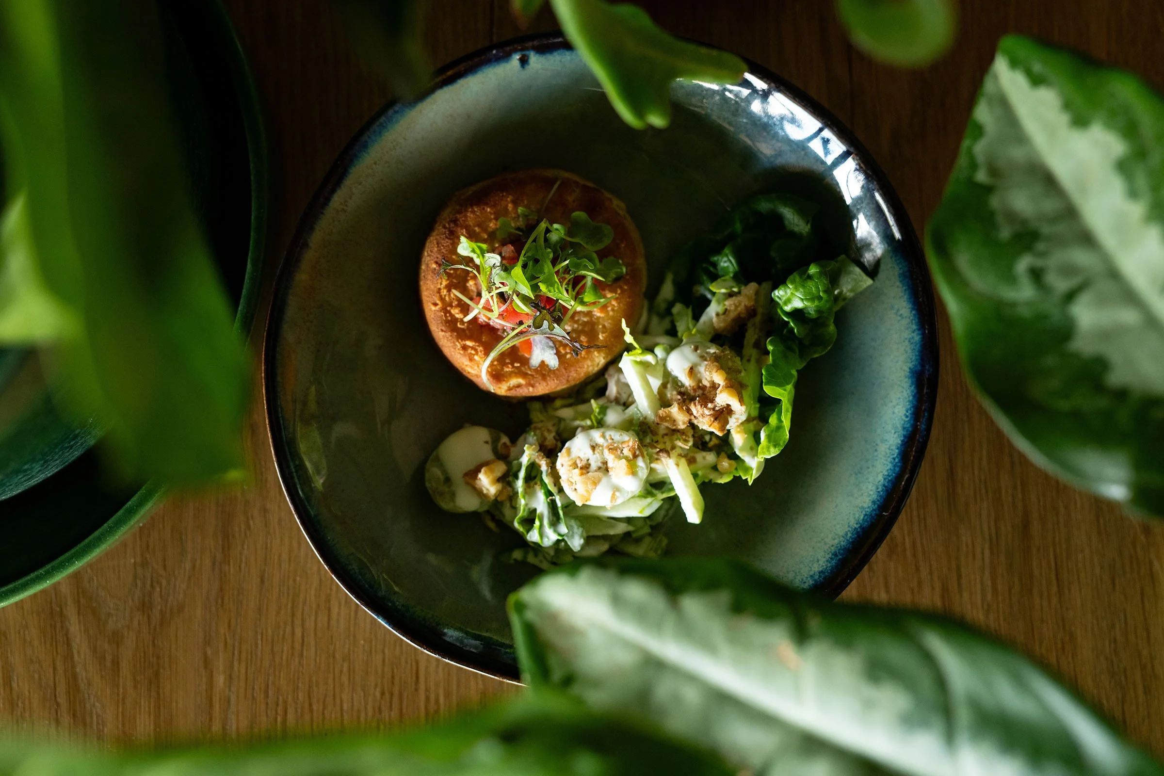 Top-down view of a bowl containing a salad with greens, a poached egg, and a garnish, set on a wooden surface, surrounded by green plants.