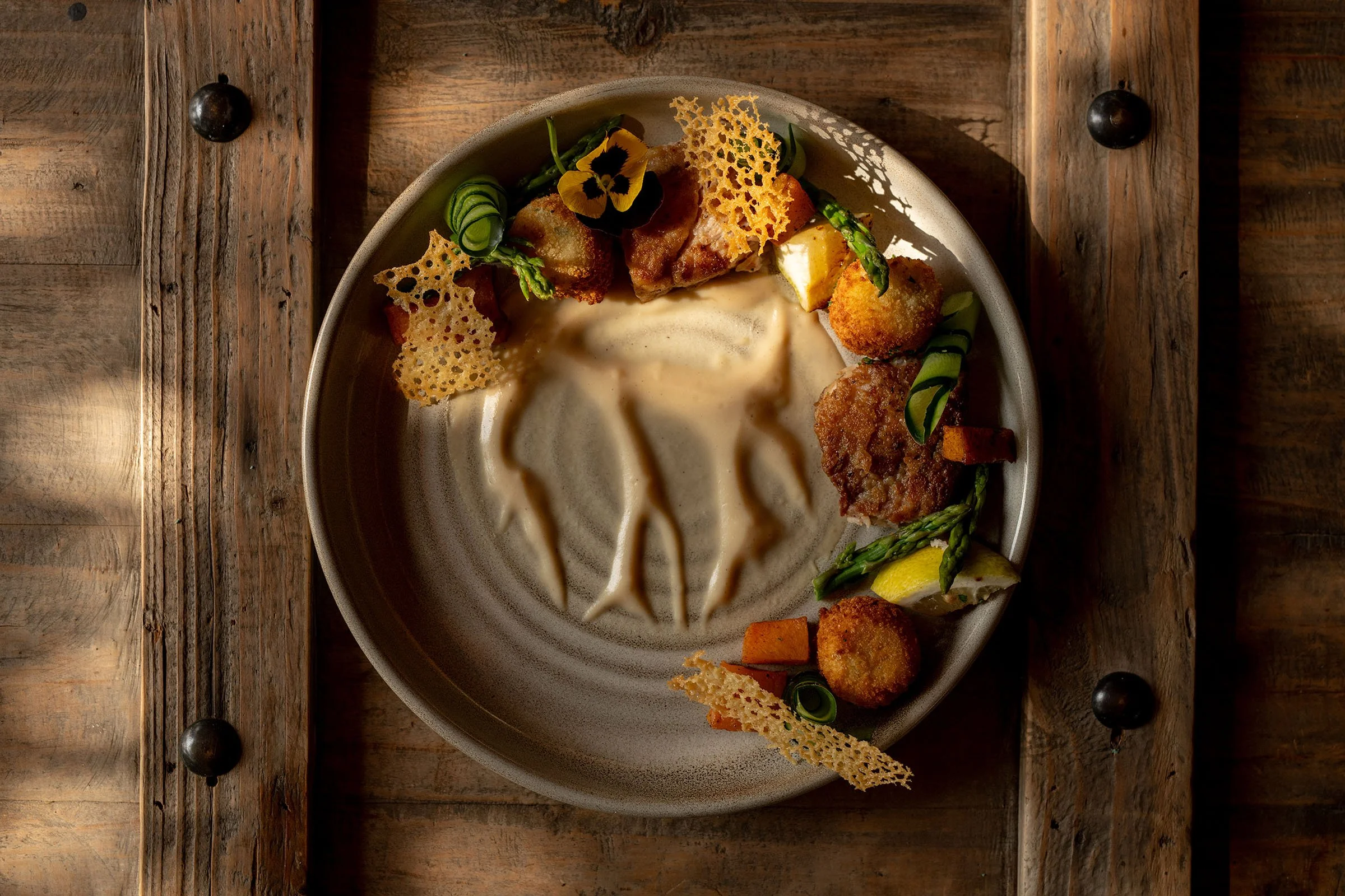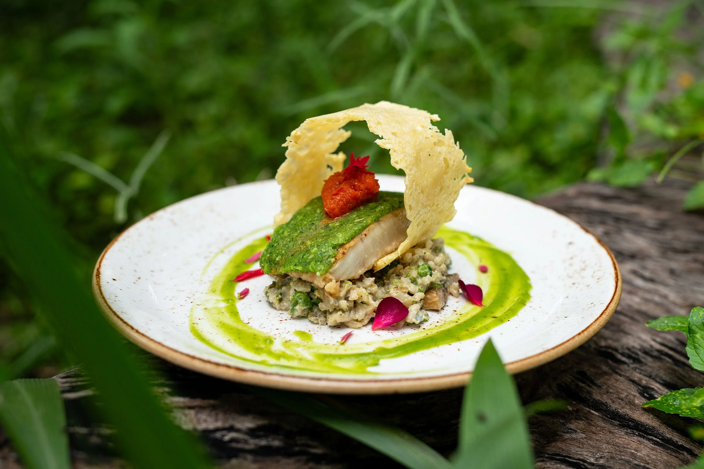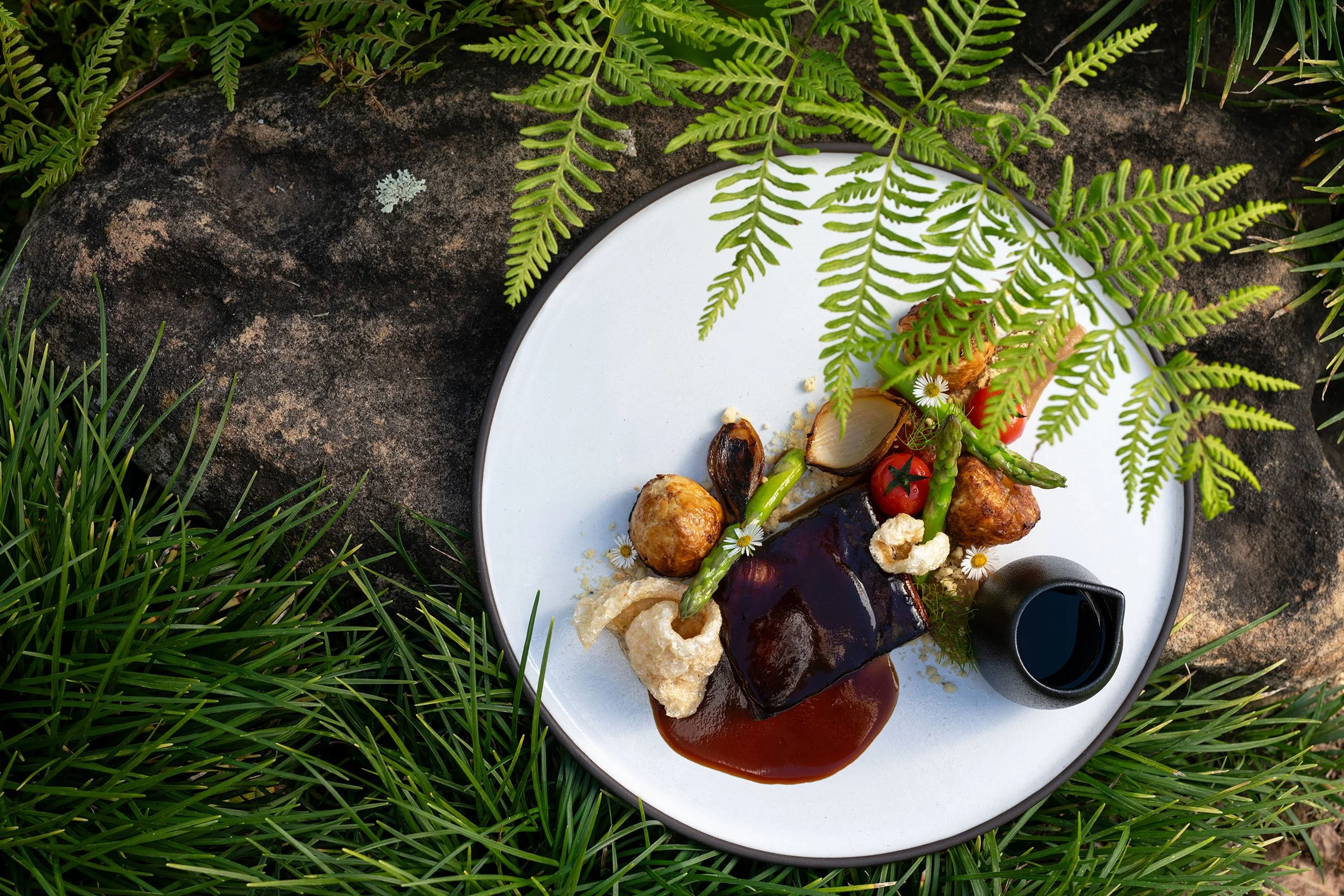 Gourmet dish served on a white plate with vegetables, meat, and sauce, placed outdoors on rocks surrounded by green fern and grass.