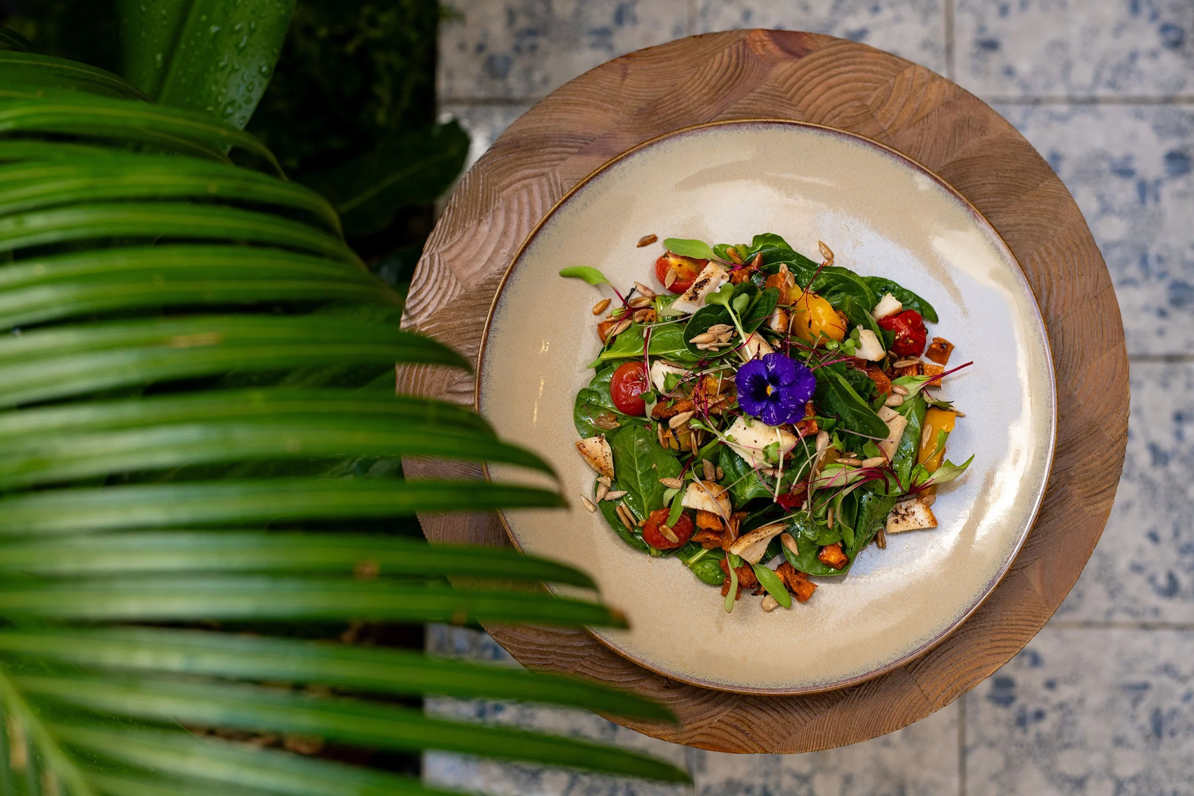 A fresh salad with mixed greens, cherry tomatoes, sunflower seeds, edible flowers, and diced cheese on a beige plate, placed on a wooden table with green plants nearby. View fullsize