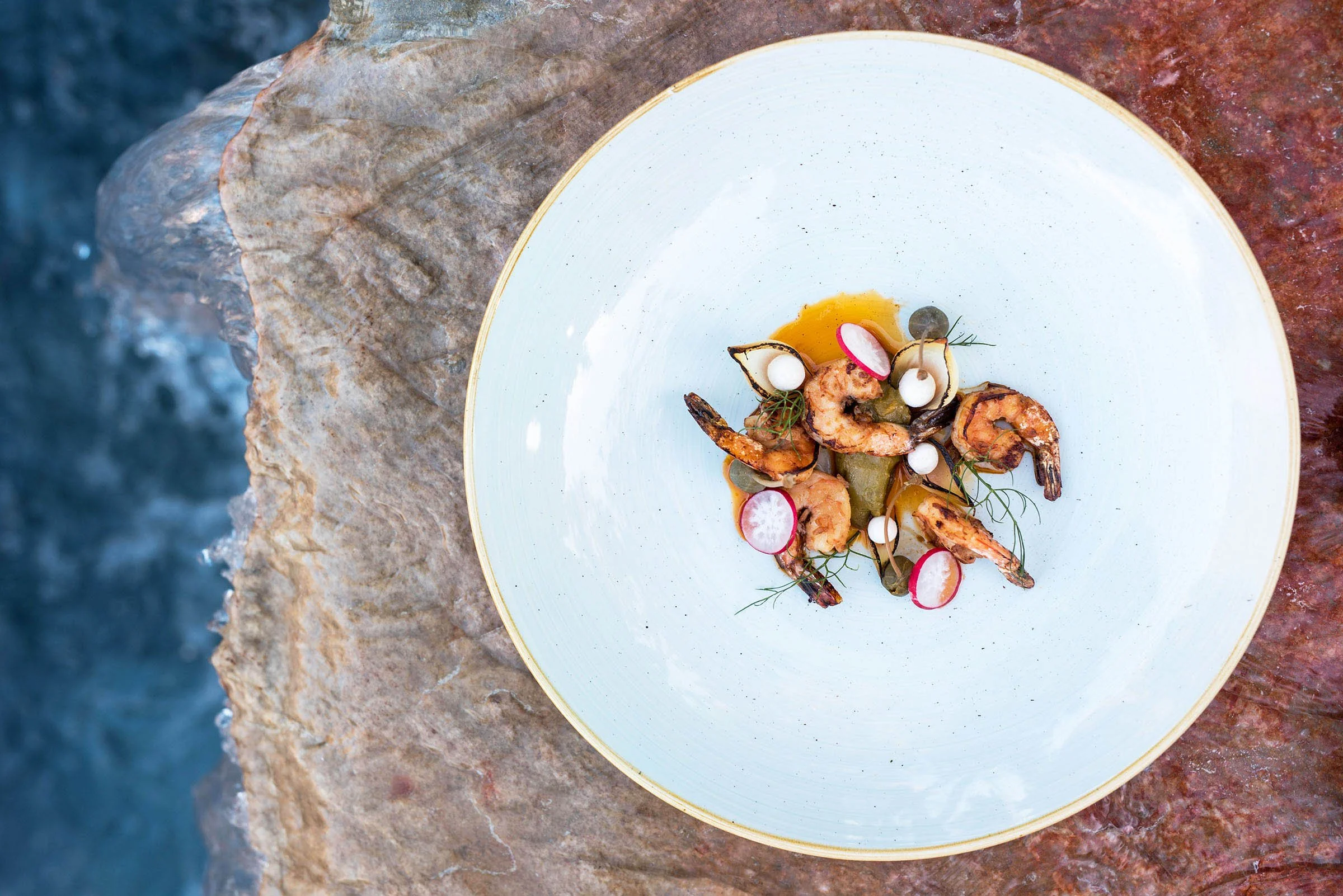 A plate of cooked shrimp garnished with radish slices, herbs, and small dollops of sauce, placed on a flat surface near water. View fullsize