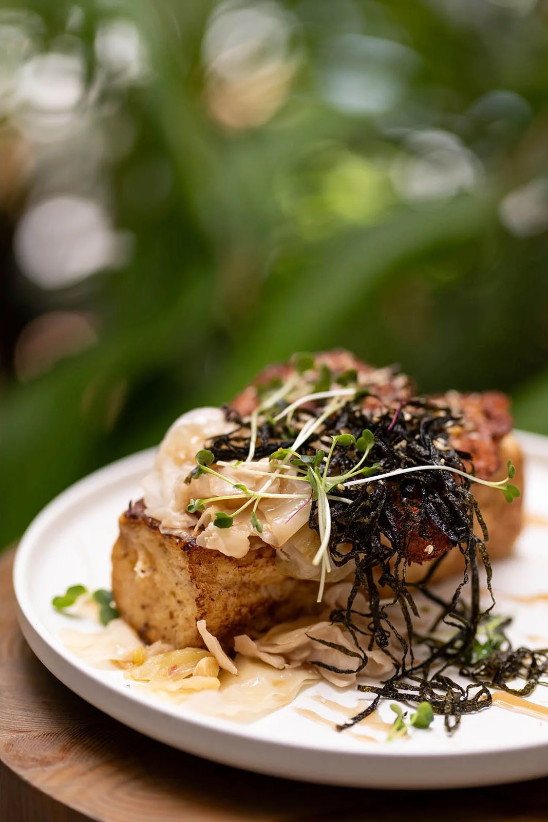A plated dish with a slice of savory bread pudding topped with shredded cheese, seaweed, microgreens, and sauce on a white plate. View fullsize