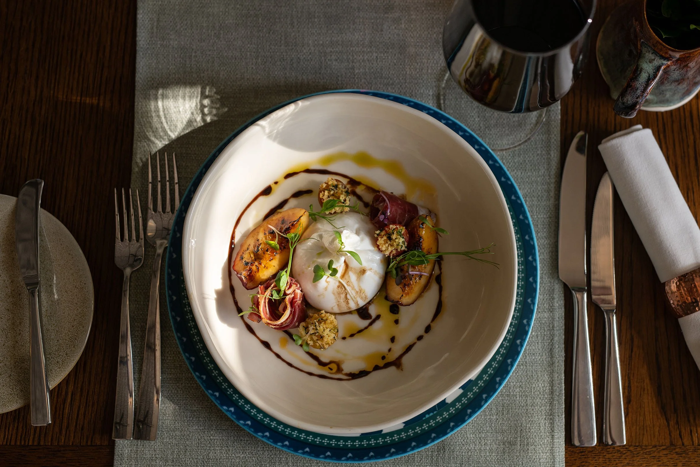 A plated gourmet dish with roasted peaches, prosciutto, burrata cheese, microgreens, balsamic glaze, and olive oil on a white and blue patterned plate, set on a wooden table with silverware and a glass of red wine. View fullsize