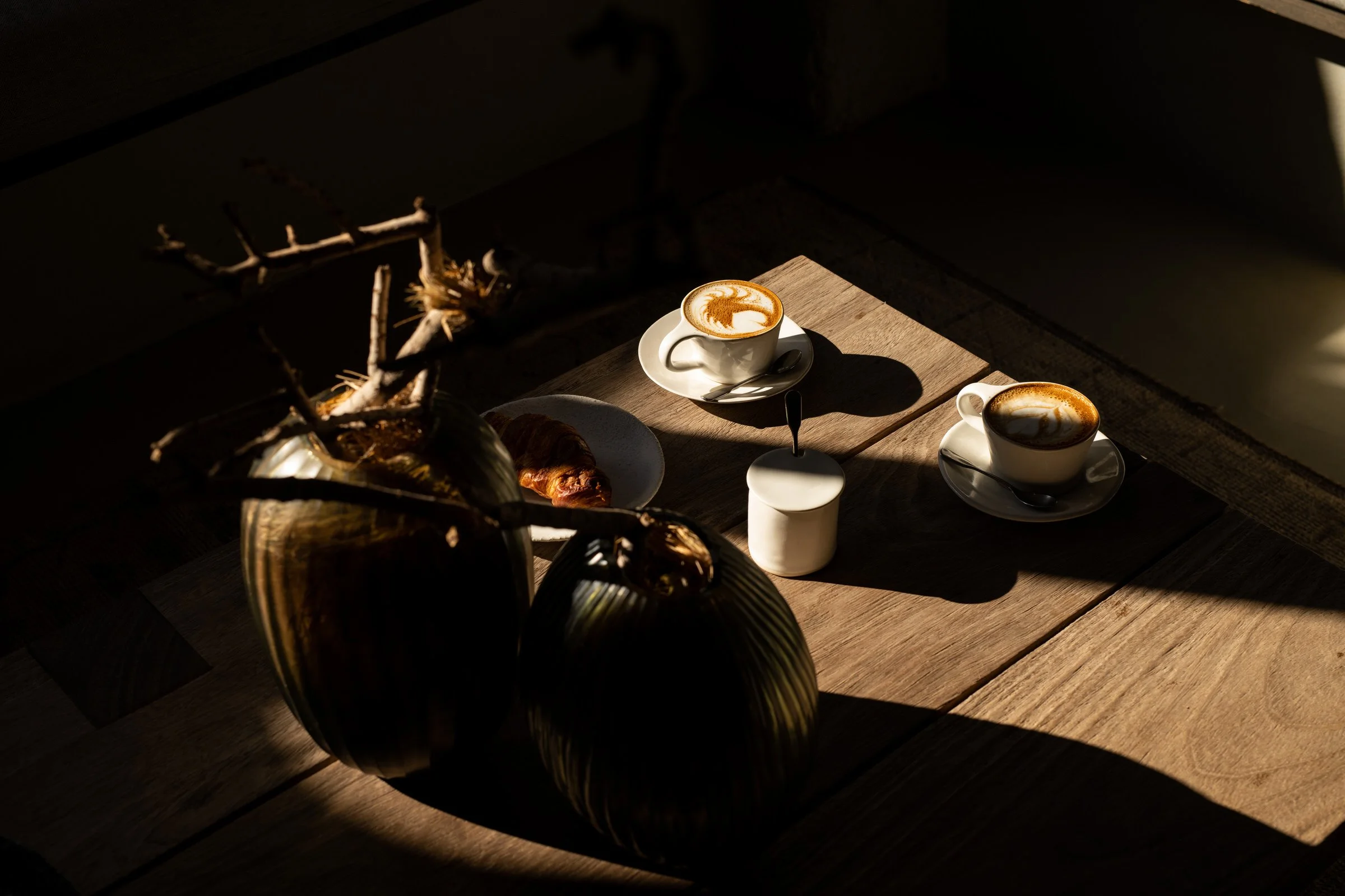 Two cups of coffee with latte art on a wooden table, accompanied by a croissant and a small white container, with sunlight casting shadows on the scene. View fullsize