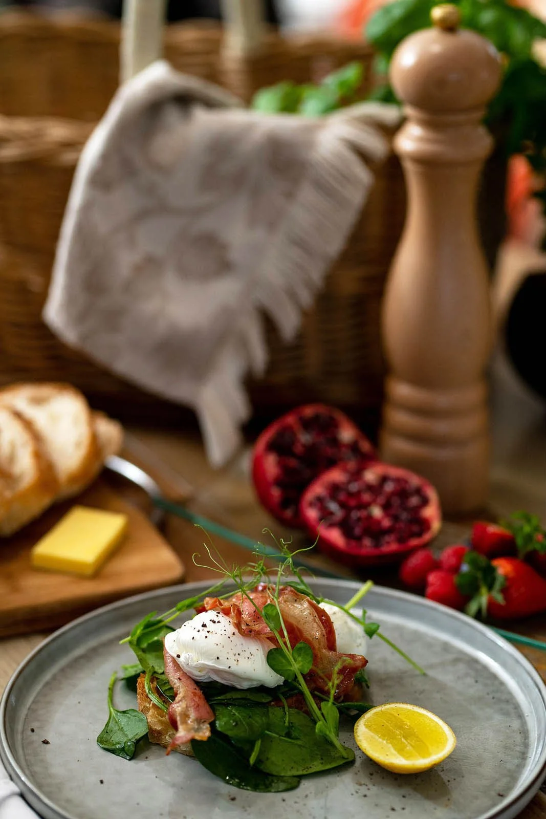 Poached egg with bacon and greens on a plate, garnished with lemon, in a cozy kitchen setting with bread, butter, pomegranate, strawberries, and a wooden pepper mill in the background.