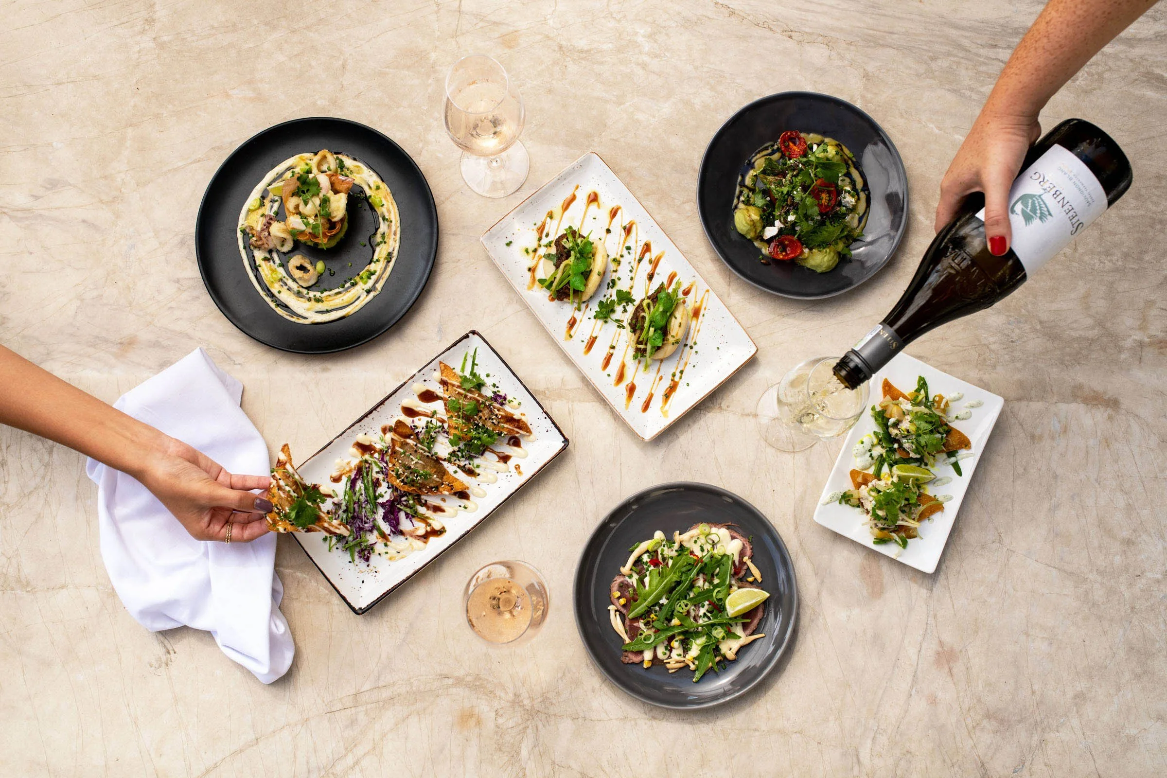 Top-down view of a table with assorted dishes and glasses of white wine, with a hand pouring wine into a glass.